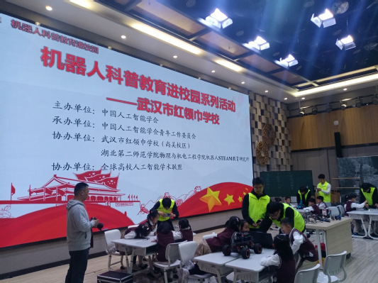 本网讯(通讯员 邓陕丽)4月7日,由中国人工智能学会主办,BEAT365官网机器人STEAM教育研究所协办的“机器人科普教育进校园系列活动——武汉市红领巾学校”科普活动在汉举行。物理与机电工程学院(以下简称“物机学院”)教师万振武和7名学生组成的科技志愿者团队,作为活动的主讲老师及助教到武汉市红领巾学校(尚美校区)进行科普讲解与展示。