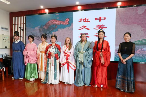 交流团深入中国传统汉服文化课堂,现场鉴赏不同朝代汉服服装,感受中国汉服之美;详细了解中国汉字从甲骨文到现代书法的演变,纷纷拿起毛笔,以“福”字来传递中外友谊;现场参观了长江主题摄影作品展,从艺术美学中了解长江地区的历史发展轨迹;沉浸式走进中国剪纸艺术,探索纸上“非遗”文化魅力。此外,在端午佳节来临之际,学校还邀请交流团共度佳节,感受中国端午文化。