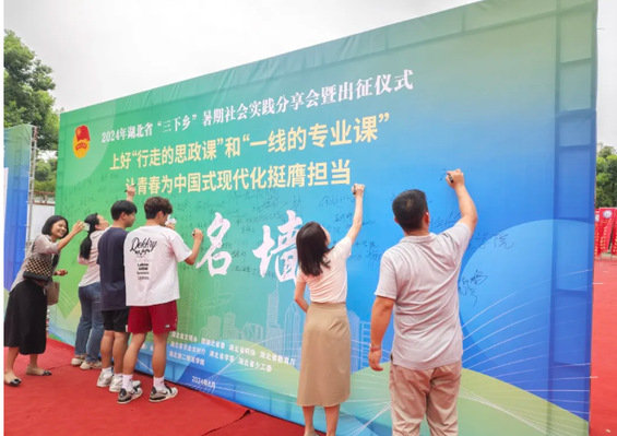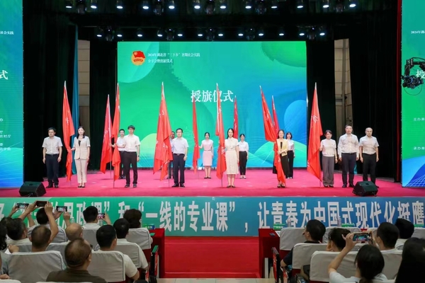 现场,与会领导为全省重点专项实践团队代表授旗。林桢栋宣布湖北省2024年“三下乡”暑期社会实践队出征。