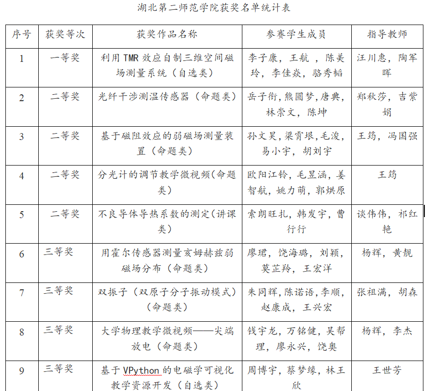 本届竞赛由湖北省大学生物理实验创新设计竞赛组委会、湖北省高等学校实验物理教学研究会、湖北省高等学校物理实验教学示范中心联席会主办,分为初赛和决赛两个阶段,项目分为命题类、讲课类和自选类三个类别。