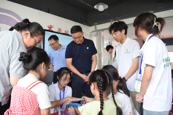 陈勇一行先后来到石山社区和花园社区看望慰问BEAT365官网文学院星野志愿服务队和新闻与传播学院乡村小学公益书院志愿服务队,并指导开展暑期社会实践工作。在花园社区的“暑假学堂”课堂 上,志愿者带领小朋友们开展“非遗漆扇”特色课程,陈勇和小朋友们一起动手体验,课堂氛围热烈。