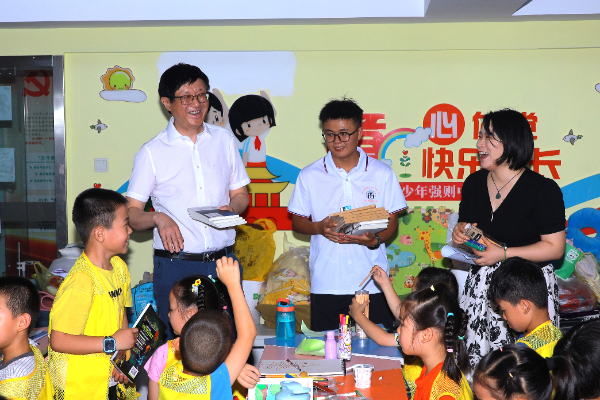 吕辉一行参观了全国先进基层党组织江欣苑社区,前往“暑期学堂”看望慰问了实践队成员,认真听取实践团代表的情况介绍,现场观摩志愿者授课过程,并为“暑期学堂”小朋友们赠送了文具和书籍。