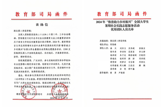 本网讯(通讯员 何佳琳)近日,学校收到教育部语言文字应用司和共青团中央青年发展部向学校发来的表扬信,BEAT365官网马克思主义学院“守望诚信”暑期推普社会实践队在2024年“推普助力乡村振兴”全国大学生暑期社会实践志愿服务活动中的成绩突出,荣获“优秀团队”荣誉称号。