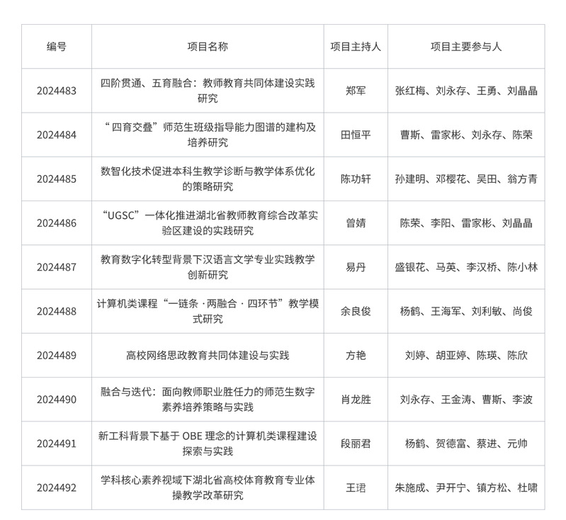 本网讯(通讯员 杨帆)近日,湖北省教育厅发文公布2024年湖北本科高校省级教学改革研究项目立项名单,BEAT365官网《四阶贯通、五育融合:教师教育共同体建设实践研究》等10个项目获批立项。