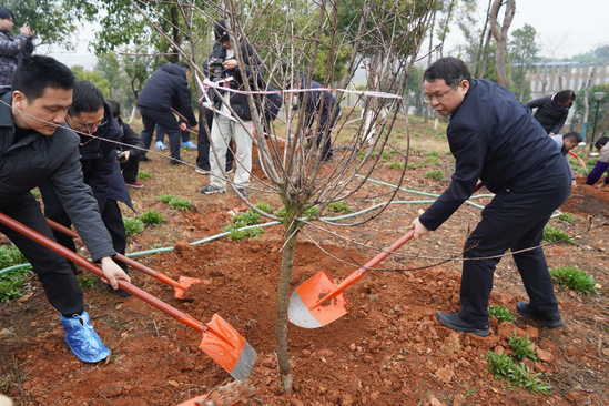 植树现场,师生们热情高涨。大家手持铁锹、水桶,分工协作,扶苗填坑,合力栽下红叶碧桃、桂花、李子、柿子、橘子、枣树、梨树等百余株树木。春风拂过,新栽树苗迎风挺立,充满生机。