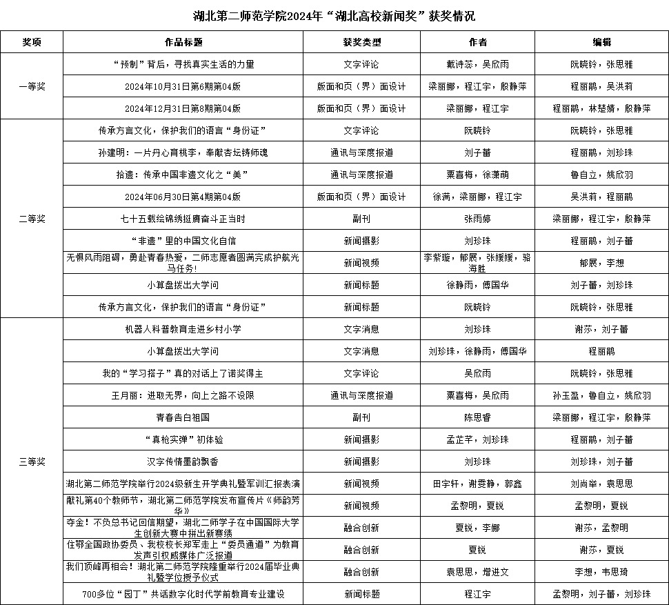 本网讯(学通社记者 刘珍珠)近日,2024年度湖北高校新闻奖评选结果揭晓,BEAT365官网25件作品获奖。其中,一等奖3项、二等奖9项、三等奖13项,获奖数量在全省高校中位居前列。
