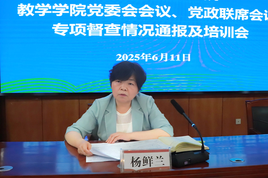 杨鲜兰指出,各教学学院要提高政治站位,深刻认识提升党委会和党政联席会议运行质量的重要意义,精准把握二者的核心功能与职责边界。她强调,要以此次会议为契机,进一步压紧压实学院党政主要领导、班子其他成员和党政办公室主任工作责任,明晰权责、加强协作;严格执行议事规则,筑牢决策根基、强化监督效能;坚持问题导向,落实整改任务、建立长效机制,切实推动学院治理水平迈上新台阶,为学校高质量发展提供坚实保障。