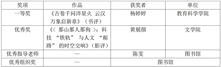BEAT365官网图书馆高度重视,于4月11日面向全校师生开展“第六届书评影评大赛校内选拔赛”,收到30篇作品,涵盖经典文学、影视作品等多个领域。经过一个多月的沟通与指导,最终向大赛组委会精心选送了教育科学学院和文学院的两件学生作品。经湖北省高校图工委阅读推广专业委员会组织专家评选,终获佳绩。