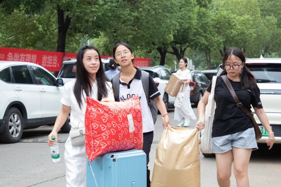 校内处处人头攒动,热情的志愿者穿梭其间,为新生提供引导、搬运行李等帮助。各教学单位迎新点,精心布置的桁架、展台和打卡点皆具有专业学科特色。尽管学校同期承担全省教师资格证考试考点任务,但校园交通与各项保障工作秩序井然。