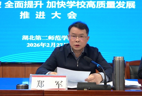 校长郑军全面回顾了学校2025年工作成果,并对2026年重点工作作出部署。郑军指出,2026年大事多、任务重,既是“十五五”规划的开局起步之年、湖北加快建设高等教育强省的关键之年,更是学校申硕攻坚的决战之年、迎接省委巡视的“体检”之年、庆祝建校95周年的荣光之年。他强调,全校上下要清醒研判外部形势,精准把握上级要求,认真审视问题短板,聚焦申硕决战、“学科建设年”、教育教学改革、科研创新引领、开放合作办学、内部治理改革、全面从严治党等七大重点任务,聚力突破、全面提升,奋力谱写教师教育领先的国内一流师范大学建设新篇章。