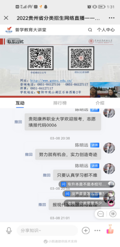 2022年3月8日晚上8:00,学校党委委员、副院长杨虹参加由贵阳日报传媒集团新媒体运营中心联合贵州普学教育科技有限公司共同主办的“2022 年贵州省分类招生线上巡展”直播。本次直播同步zaker直播、百度直播、今日头条直播等多个平台,约17000多人观看。