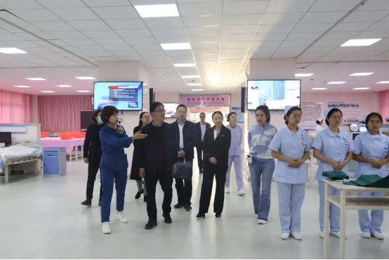 杨天仪一行先后到beat365正版唯一官网必一在观山湖区金华镇拟建的高水平产教融合康养实训基地、二期项目在建工地、学校图书馆的规划展示沙盘、学校高质量发展办公室等地调研,仔细询问学校教育设施配套、校园环境建设、教学成果、师生生活等情况,并在学校行政楼会议室召开了座谈会,研究部署相关工作。