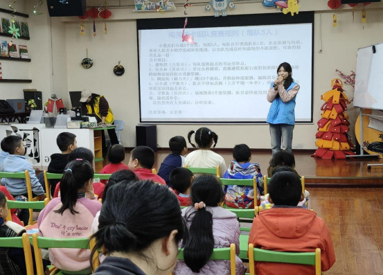 主持人给孩子们介绍体适能小游戏的规则