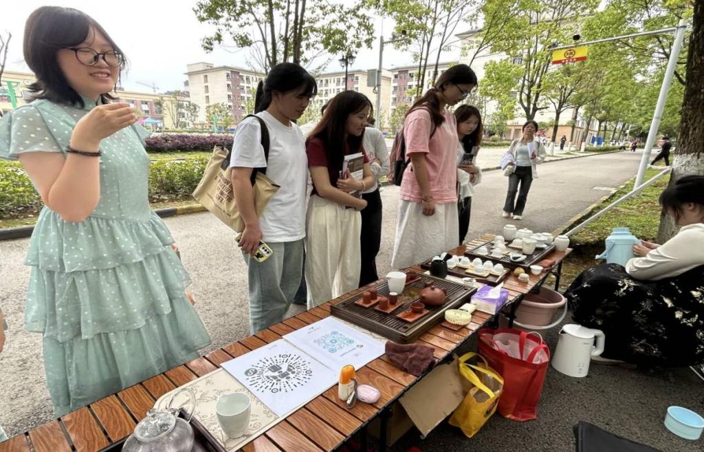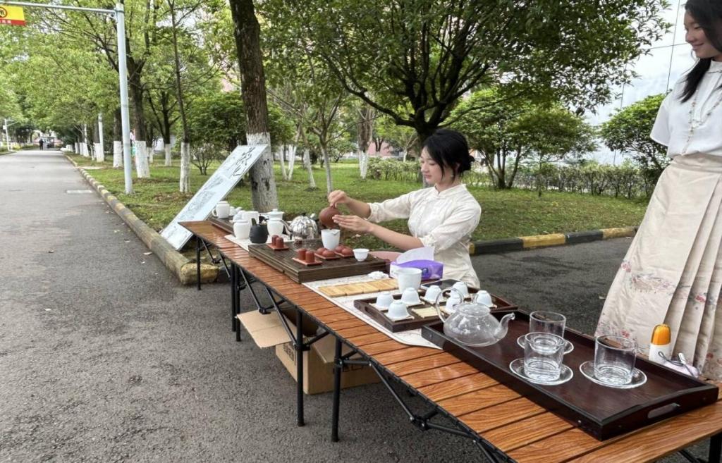 活动伊始,茶艺社的专业人员开始展示精湛的茶艺茶道。他们动作娴熟,有条不紊地冲泡着各类茶叶,从温杯、投茶到注水、出汤,每一个步骤都如行云流水般自然流畅,充分展现了中国传统茶艺的优雅与魅力。在2025年6月9日,“探韵乌龙,共品茶香”活动在篮球场对面开展。